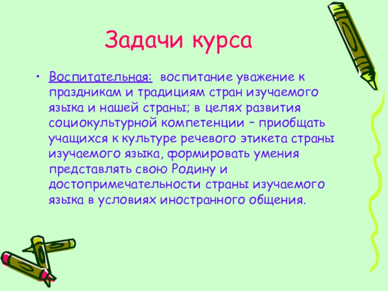 и нашей страны; в целях развития социокультурной компетенции – приобщать учащихся к культуре речевого этикета страны изучаемого языка, формировать умения представлять свою Родину и достопримечательности страны изучаемого языка в условиях иностранного общения.