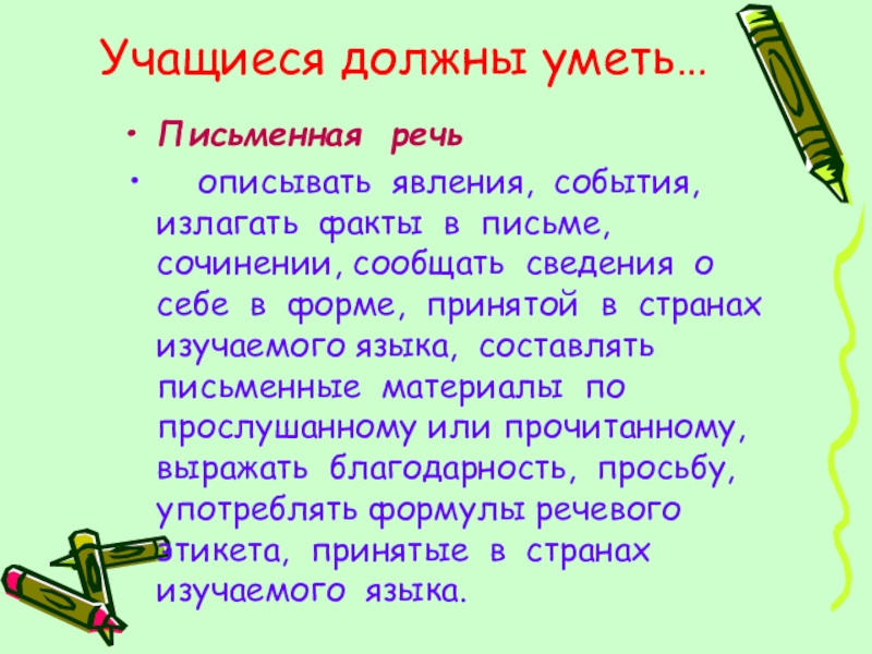 письме, сочинении, сообщать сведения о себе в форме, принятой в странах изучаемого языка, составлять письменные материалы по прослушанному или прочитанному, выражать благодарность, просьбу, употреблять формулы речевого этикета, принятые в странах изучаемого языка.