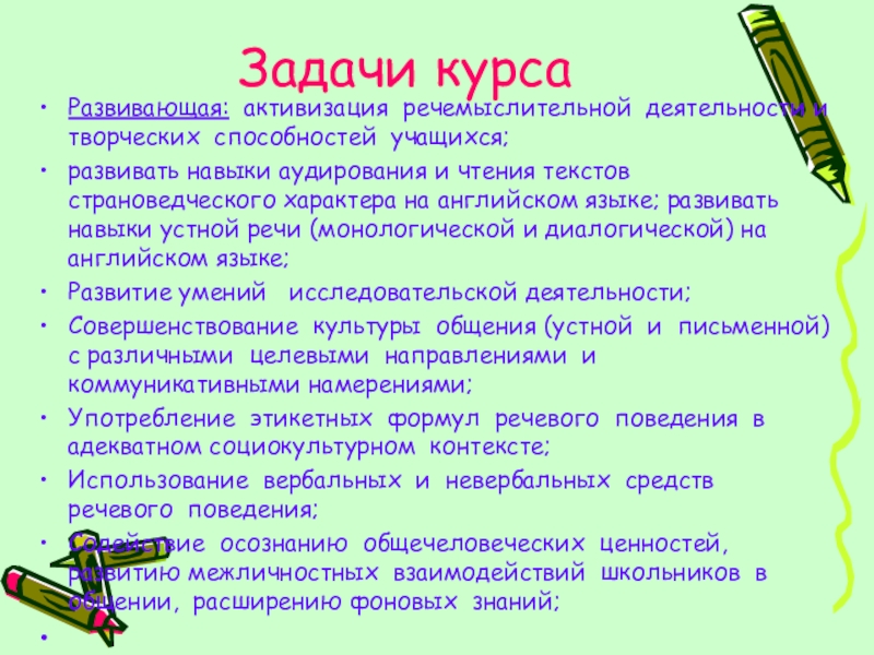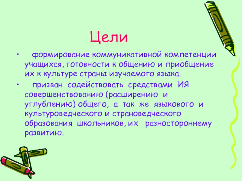 призван содействовать средствами ИЯ совершенствованию (расширению и углублению) общего, а так же языкового и культуроведческого и страноведческого образования школьников, их разностороннему развитию.