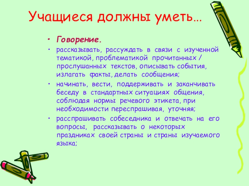 расспрашивать собеседника и отвечать на его вопросы, рассказывать о некоторых праздниках своей страны и страны изучаемого языка;