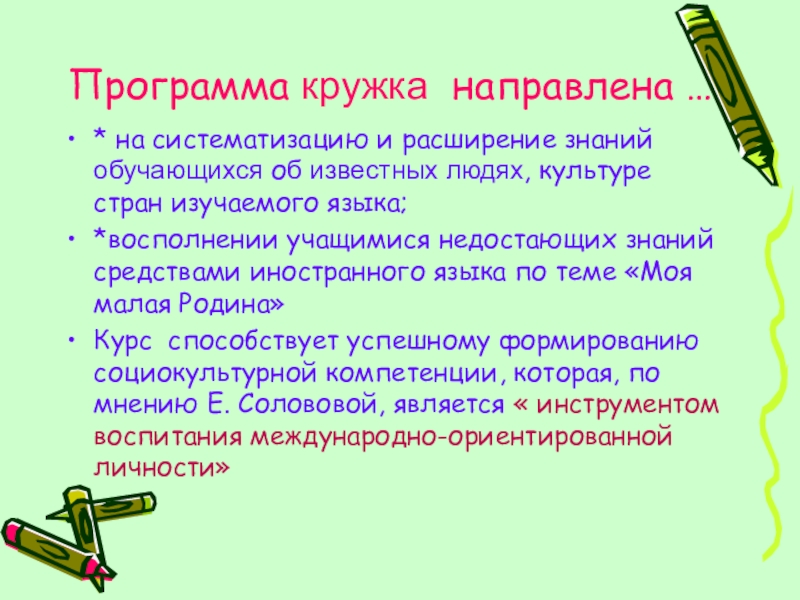 Курс способствует успешному формированию социокультурной компетенции, которая, по мнению Е. Солововой, является « инструментом воспитания международно-ориентированной личности»