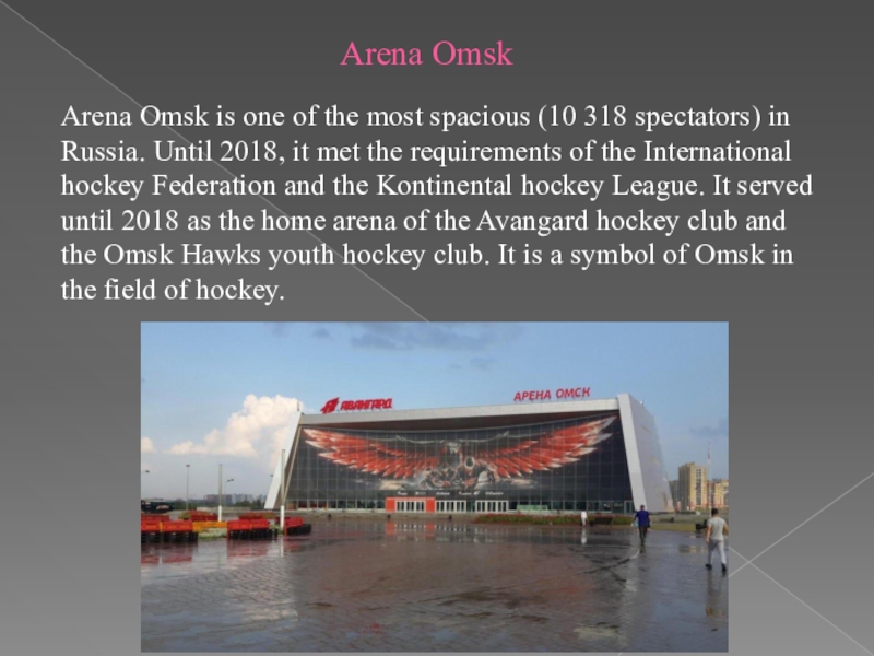 318 spectators) in Russia. Until 2018, it met the requirements of the International hockey Federation and the Kontinental hockey League. It served until 2018 as the home arena of the Avangard hockey club and the Omsk Hawks youth hockey club. It is a symbol of Omsk in the field of hockey.
