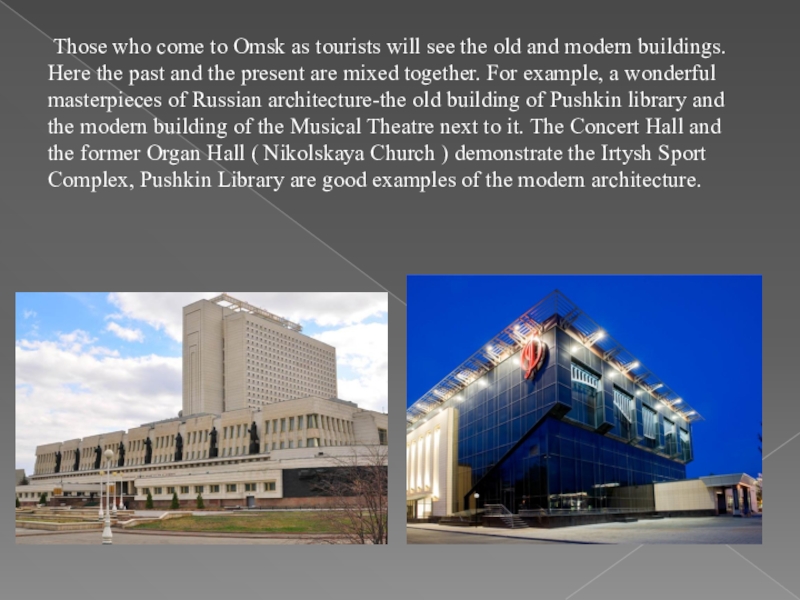 old and modern buildings. Here the past and the present are mixed together. For example, a wonderful masterpieces of Russian architecture-the old building of Pushkin library and the modern building of the Musical Theatre next to it. The Concert Hall and the former Organ Hall ( Nikolskaya Church ) demonstrate the Irtysh Sport Complex, Pushkin Library are good examples of the modern architecture.