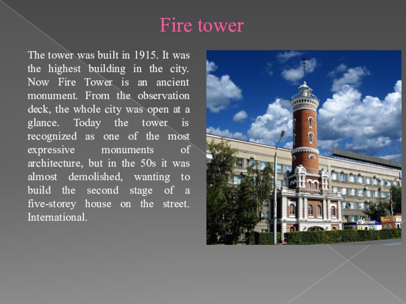 building in the city. Now Fire Tower is an ancient monument. From the observation deck, the whole city was open at a glance. Today the tower is recognized as one of the most expressive monuments of architecture, but in the 50s it was almost demolished, wanting to build the second stage of a five-storey house on the street. International.