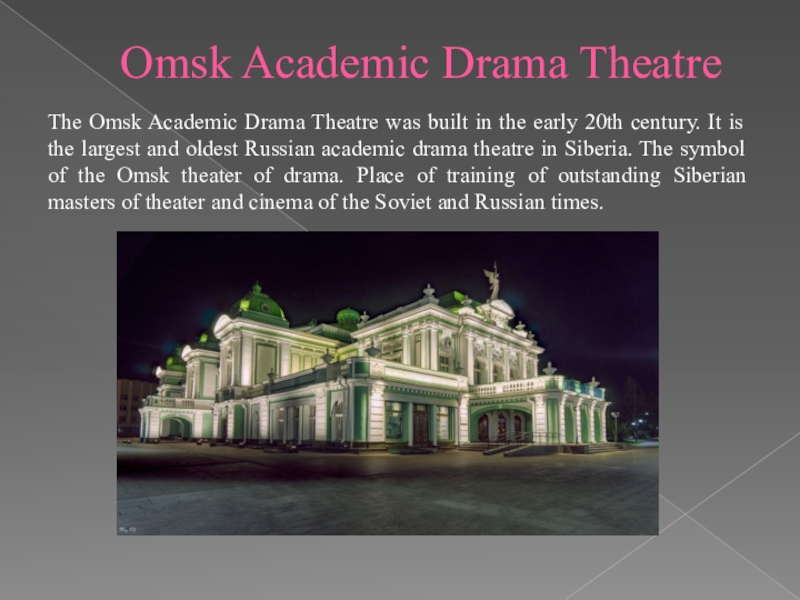 the early 20th century. It is the largest and oldest Russian academic drama theatre in Siberia. The symbol of the Omsk theater of drama. Place of training of outstanding Siberian masters of theater and cinema of the Soviet and Russian times.