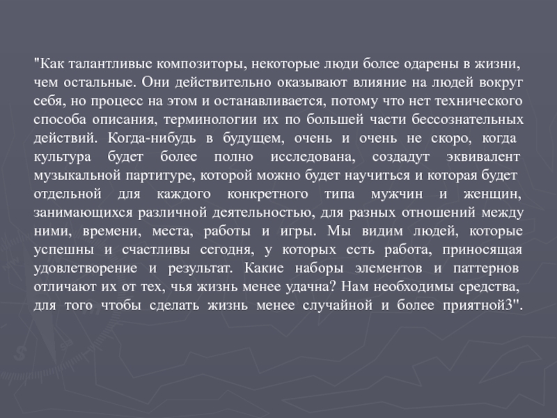 Они действительно оказывают влияние на людей вокруг себя, но процесс на этом и останавливается, потому что нет технического способа описания, терминологии их по большей части бессознательных действий. Когда-нибудь в будущем, очень и очень не скоро, когда культура будет более полно исследована, создадут эквивалент музыкальной партитуре, которой можно будет научиться и которая будет отдельной для каждого конкретного типа мужчин и женщин, занимающихся различной деятельностью, для разных отношений между ними, времени, места, работы и игры. Мы видим людей, которые успешны и счастливы сегодня, у которых есть работа, приносящая удовлетворение и результат. Какие наборы элементов и паттернов отличают их от тех, чья жизнь менее удачна? Нам необходимы средства, для того чтобы сделать жизнь менее случайной и более приятной3".