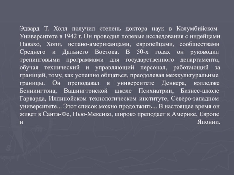 Слайд 8Эдвард Т. Холл получил степень доктора наук в Колумбийском Университете в