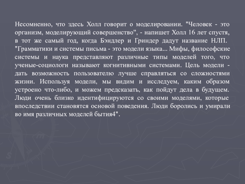 моделирующий совершенство", - напишет Холл 16 лет спустя, в тот же самый год, когда Бэндлер и Гриндер дадут название НЛП. "Грамматики и системы письма - это модели языка... Мифы, философские системы и наука представляют различные типы моделей того, что ученые-социологи называют когнитивными системами. Цель модели - дать возможность пользователю лучше справляться со сложностями жизни. Используя модели, мы видим и исследуем, каким образом устроено что-либо, и можем предсказать, как пойдут дела в будущем. Люди очень близко идентифицируются со своими моделями, которые впоследствии становятся основой поведения. Люди боролись и умирали во имя различных моделей бытия4".
