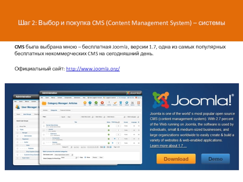 CMS была выбрана мною – бесплатная Joomla, версии 1.7, одна из самых популярных бесплатных некоммерческих CMS на сегодняшний день.