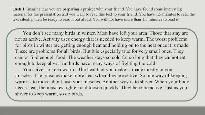 Task 1. Imagine that you are preparing a project with your friend. You have found some interesting material for the presentation and you want to read this text to your friend. You have 1.5 minutes to read the text silently, then be ready to read it out aloud. You will not have more than 1.5 minutes to read it.