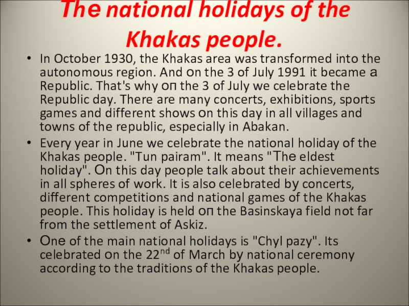 area was transformed into the autonomous region. And оn the 3 of July 1991 it became а Republic. That's why оп the 3 of July we celebrate the Republic day. There are many concerts, exhibitions, sports games and different shows оn this day in all villages and towns of the republic, especially in Abakan.