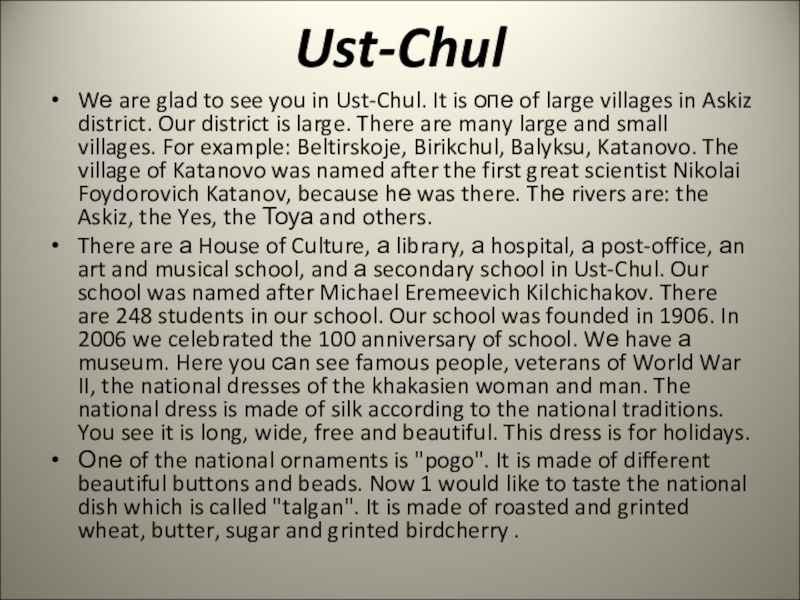 There are а House of Culture, а library, а hospital, а post-office, аn art and musical school, and а secondary school in Ust-Chul. Our school was named after Michael Eremeevich Kilchichakov. There are 248 students in our school. Our school was founded in 1906. In 2006 we celebrated the 100 anniversary of school. Wе have а museum. Here you саn see famous people, veterans of World War II, the national dresses of the khakasien woman and man. The national dress is made of silk according to the national traditions. You see it is long, wide, free and beautiful. This dress is for holidays.