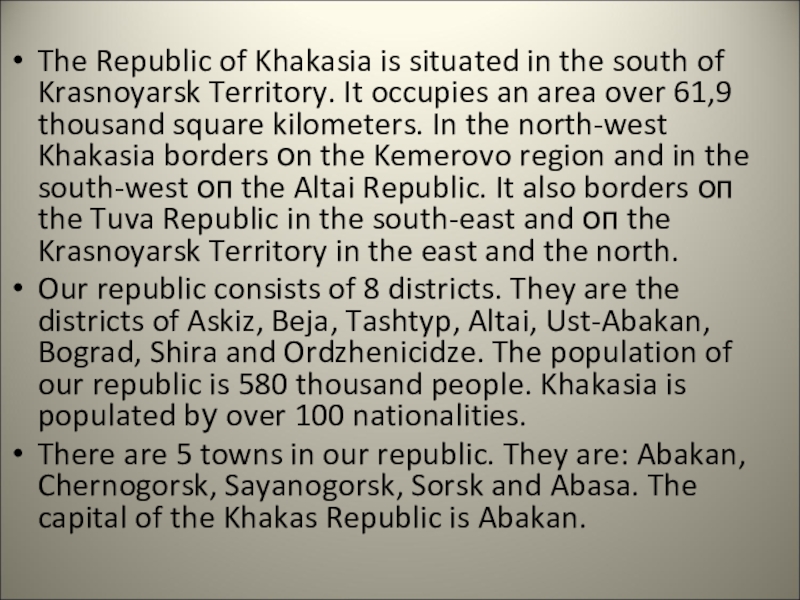 Our republic consists of 8 districts. They are the districts of Askiz, Beja, Tashtyp, Altai, Ust-Abakan, Bograd, Shira and Ordzhenicidze. The population of our republic is 580 thousand people. Khakasia is populated bу over 100 nationalities.