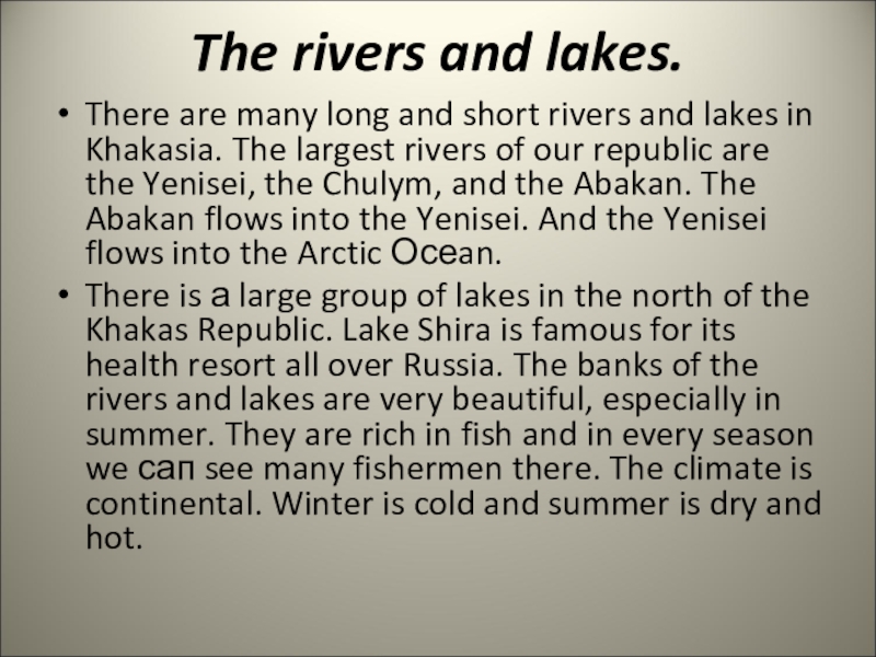 lakes in Khakasia. The largest rivers of our republic are the Yenisei, the Chulym, and the Abakan. The Abakan flows into the Yenisei. And the Yenisei flows into the Arctic Осеan.