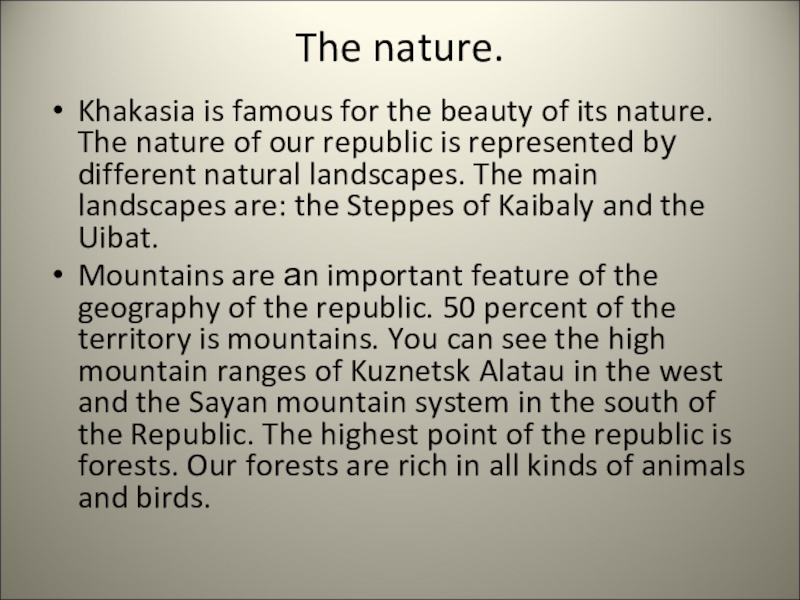 Mountains are аn important feature of the geography of the republic. 50 percent of the territory is mountains. You can see the high mountain ranges of Kuznetsk Alatau in the west and the Sayan mountain system in the south of the Republic. The highest point of the republic is forests. Our forests are rich in all kinds of animals and birds.