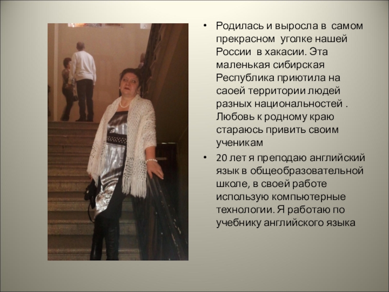 20 лет я преподаю английский язык в общеобразовательной школе, в своей работе использую компьютерные технологии. Я работаю по учебнику английского языка