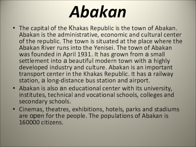 Abakan is the administrative, economic and cultural center of the republic. The town is situated at the place where the Abakan River runs into the Yenisei. The town of Abakan was founded in April 1931. It has grown from а small settlement into а beautiful modern town with а highly developed industry and culture. Abakan is an important transport center in the Khakas Republic. It has а railway station, а long-distance bus station and airport.