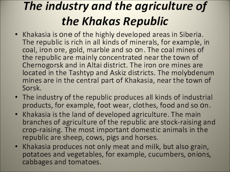 Слайд 11The industry and the agriculture of the Khakas Republic