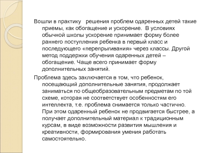 обогащение и ускорение. В условиях обычной школы ускорение принимает форму более раннего поступления ребенка в первый класс и последующего «перепрыгивания» через классы. Другой метод поддержки обучения одаренных детей – обогащение. Чаще всего принимает форму дополнительных занятий.
