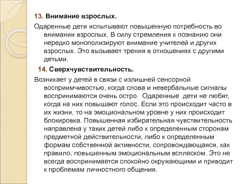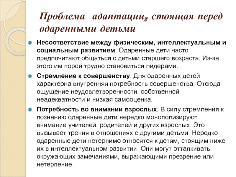 В силу стремления к познанию они нередко монополизируют внимание учителей и других взрослых. Это вызывает трения в отношениях с другими детьми.