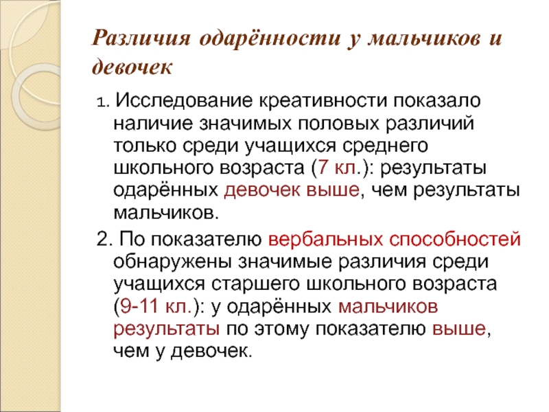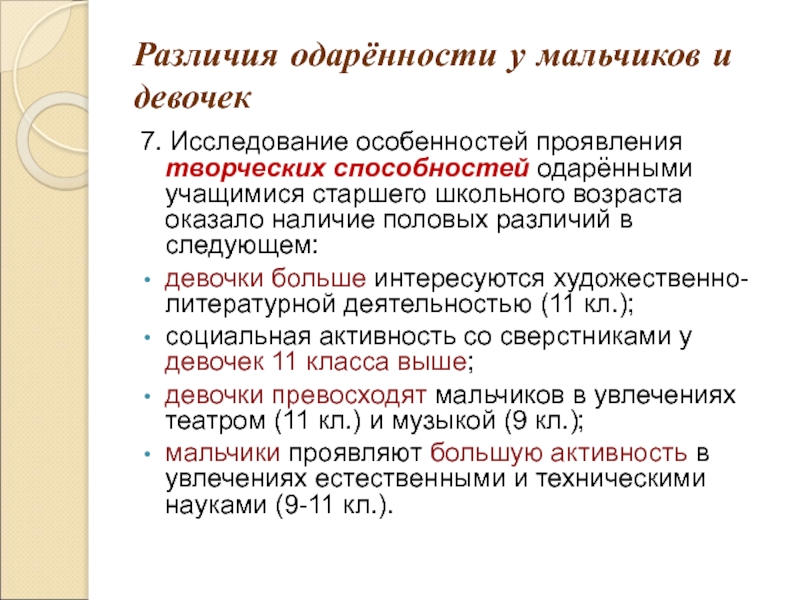 половых различий только среди учащихся среднего школьного возраста (7 кл.): результаты одарённых девочек выше, чем результаты мальчиков.