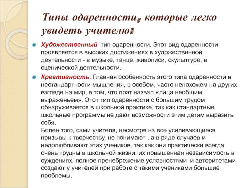 Креативность. Главная особенность этого типа одаренности в нестандартности мышления, в особом, часто непохожем на других взгляде на мир, в том, что поэт назвал «лица необщим выраженьем». Этот тип одаренности с большим трудом обнаруживается в школьной практике, так как стандартные школьные программы не дают возможности этим детям выразить себя.