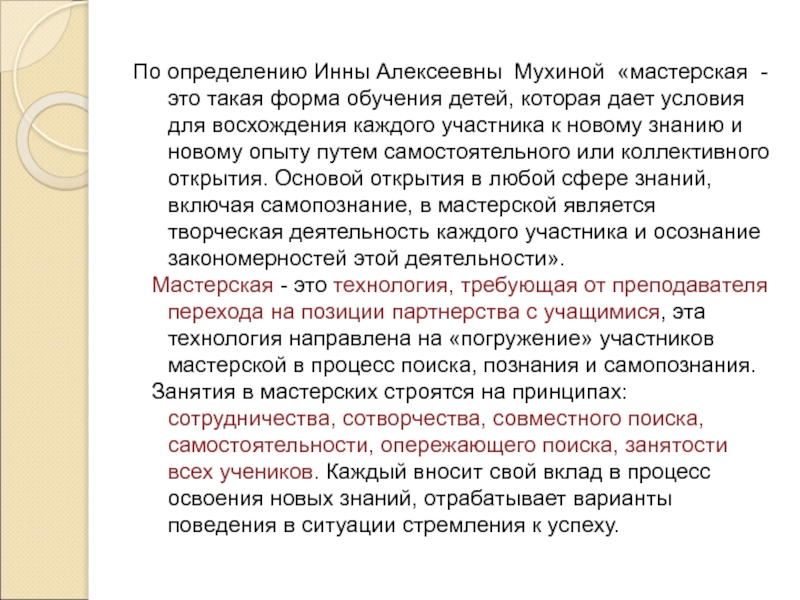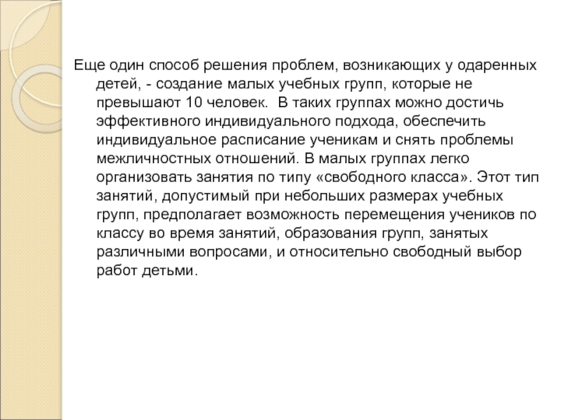 малых учебных групп, которые не превышают 10 человек. В таких группах можно достичь эффективного индивидуального подхода, обеспечить индивидуальное расписание ученикам и снять проблемы межличностных отношений. В малых группах легко организовать занятия по типу «свободного класса». Этот тип занятий, допустимый при небольших размерах учебных групп, предполагает возможность перемещения учеников по классу во время занятий, образования групп, занятых различными вопросами, и относительно свободный выбор работ детьми.