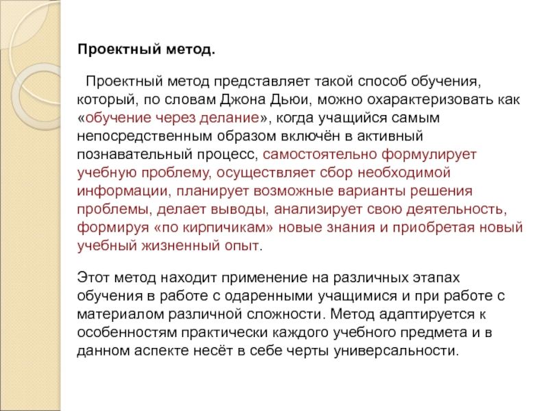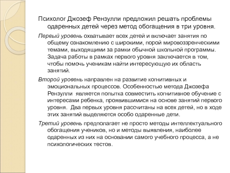 Третий уровень предполагает не просто методы интеллектуального обогащения учеников, но и методы выявления, наиболее одаренных из них на основании самого учебного процесса, а не психологических тестов.