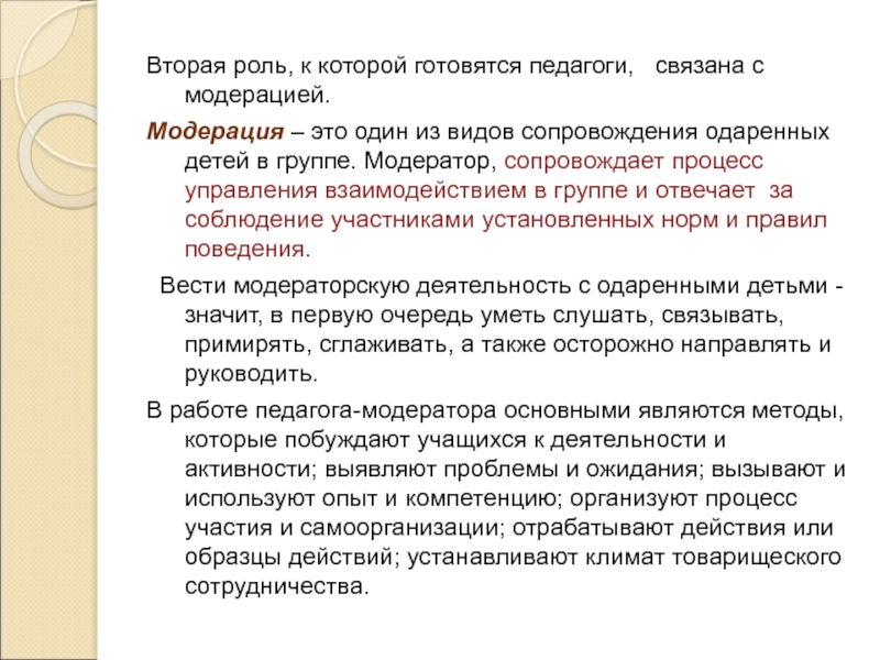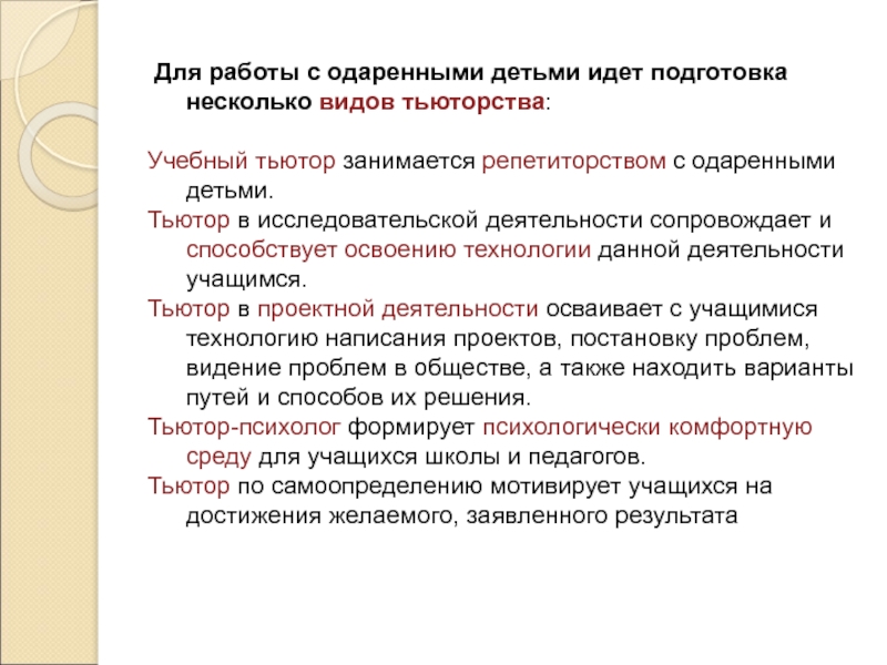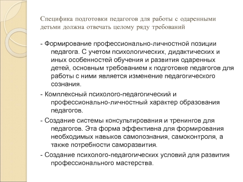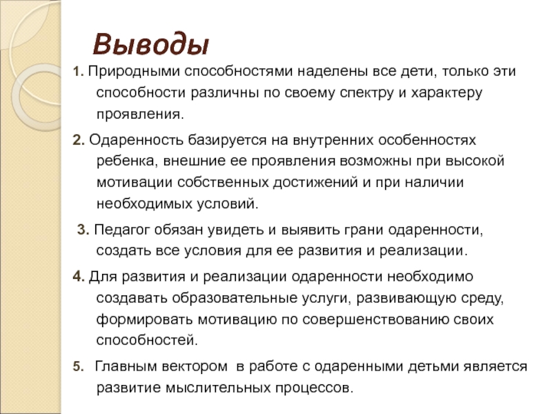 4. Для развития и реализации одаренности необходимо создавать образовательные услуги, развивающую среду, формировать мотивацию по совершенствованию своих способностей.