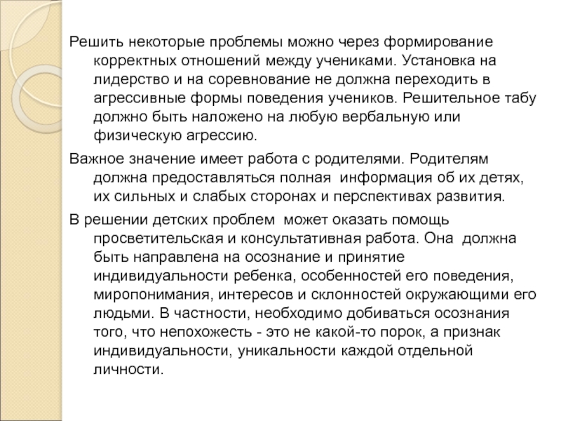 В решении детских проблем может оказать помощь просветительская и консультативная работа. Она должна быть направлена на осознание и принятие индивидуальности ребенка, особенностей его поведения, миропонимания, интересов и склонностей окружающими его людьми. В частности, необходимо добиваться осознания того, что непохожесть - это не какой-то порок, а признак индивидуальности, уникальности каждой отдельной личности.