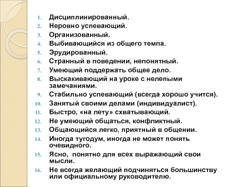 Более того, сами учителя, несмотря на все усиливающиеся призывы к творчеству, не понимают , а в ряде случаев и недолюбливают этих учеников, так как они практически всегда очень трудны в школьной жизни: их повышенная независимость в суждениях, полное пренебрежение условностями и авторитетами создают у учителей при работе с такими учениками большие проблемы.
