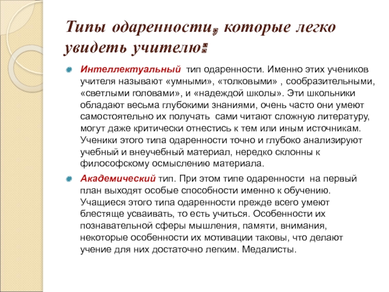 Слайд 18Типы одаренности, которые легко увидеть учителю: