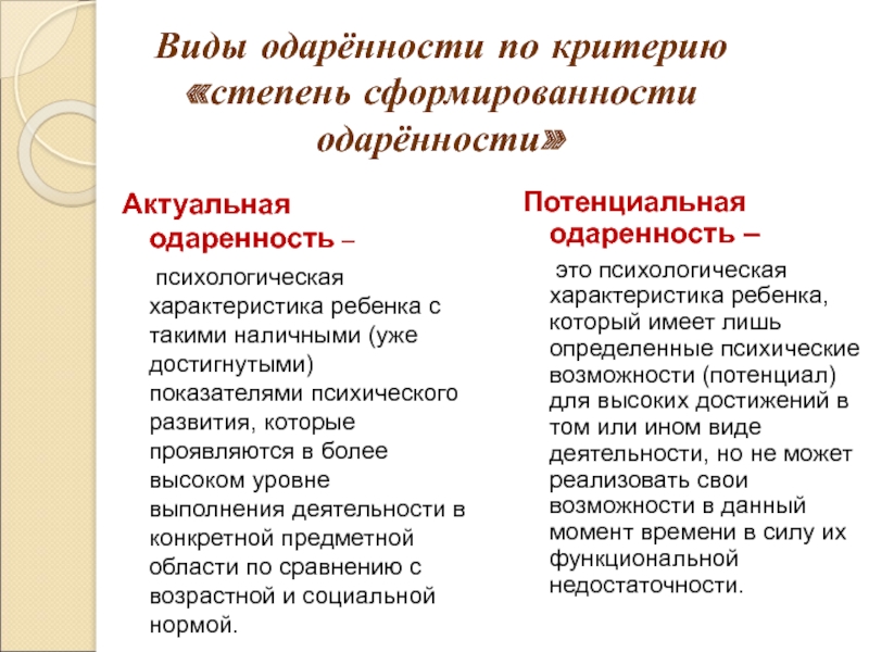 наличными (уже достигнутыми) показателями психического развития, которые проявляются в более высоком уровне выполнения деятельности в конкретной предметной области по сравнению с возрастной и социальной нормой.