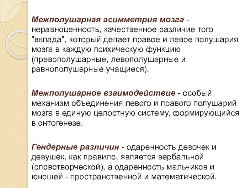 Межполушарная асимметрия мозга - неравноценность, качественное различие того "вклада", который делает