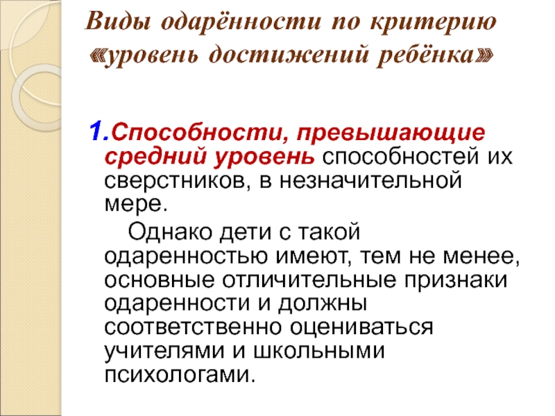Виды одарённости по критерию «уровень достижений ребёнка»