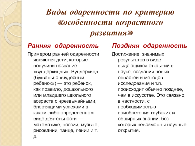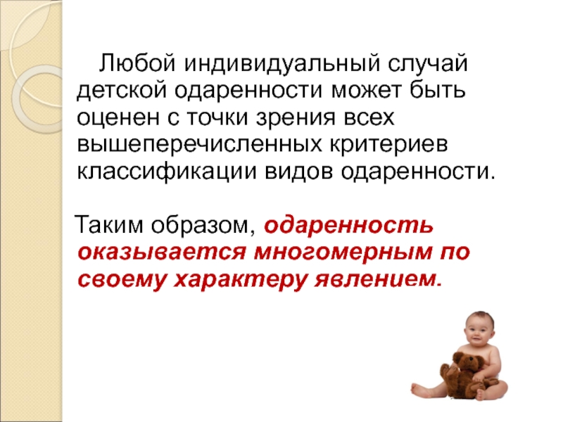 с точки зрения всех вышеперечисленных критериев классификации видов одаренности.