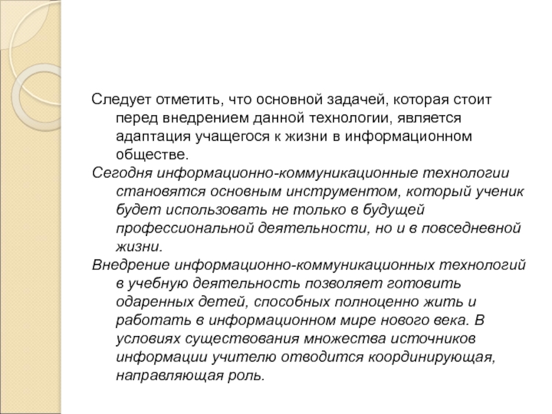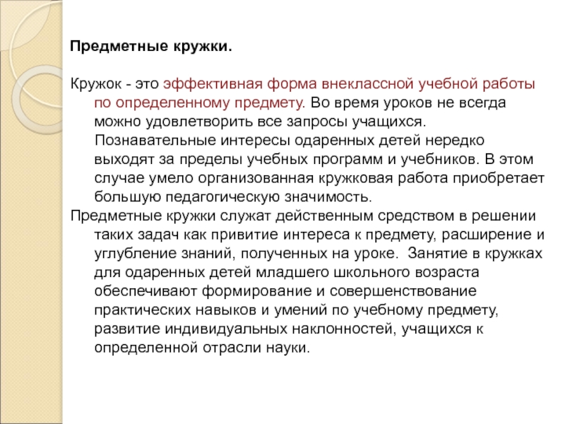 Проблема здесь заключается в том, что ребенок, посещающий дополнительные занятия, продолжает заниматься по общеобразовательным предметам по той схеме, которая не соответствует особенностям его интеллекта, т.е. проблема снимается только частично. При этом одаренный ребенок не продвигается быстрее, а получает дополнительный материал к традиционным курсам, в виде возможности развития мышления и креативности, формирования умения работать самостоятельно.