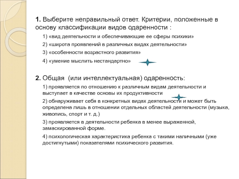 1. Выберите неправильный ответ. Критерии, положенные в основу классификации видов одаренности