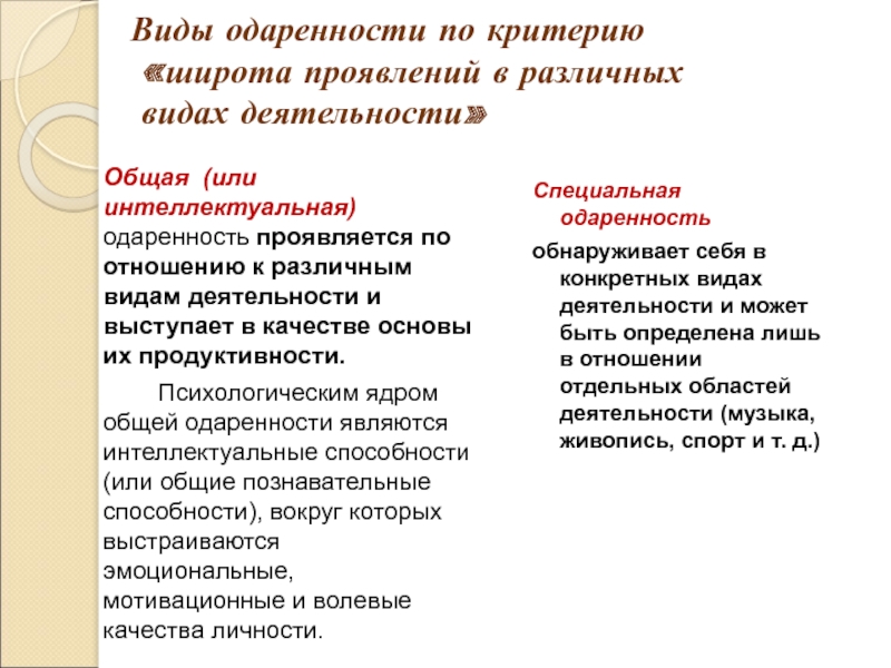 Слайд 3Виды одарённости по критерию «Виды деятельности и обеспечивающие её сферы»