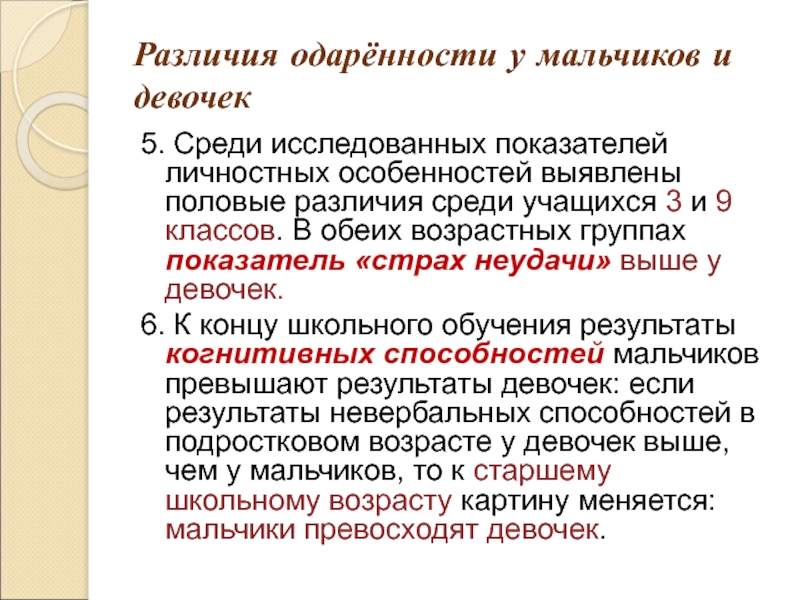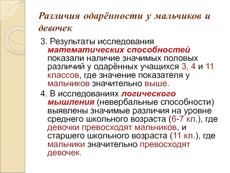 Гендерные различия - одаренность девочек и девушек, как правило, является вербальной (словотворческой), а одаренность мальчиков и юношей - пространственной и математической.