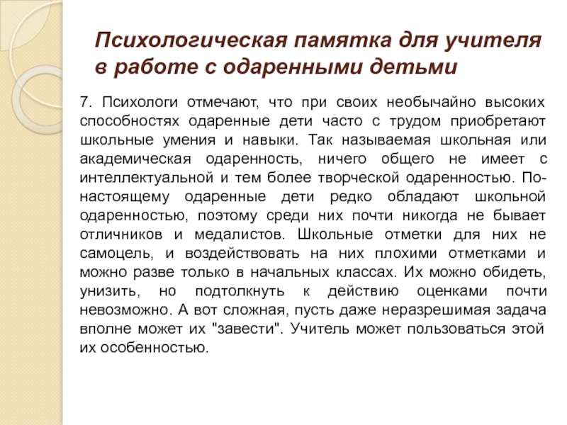 Однако дети с такой одаренностью имеют, тем не менее, основные отличительные признаки одаренности и должны соответственно оцениваться учителями и школьными психологами.