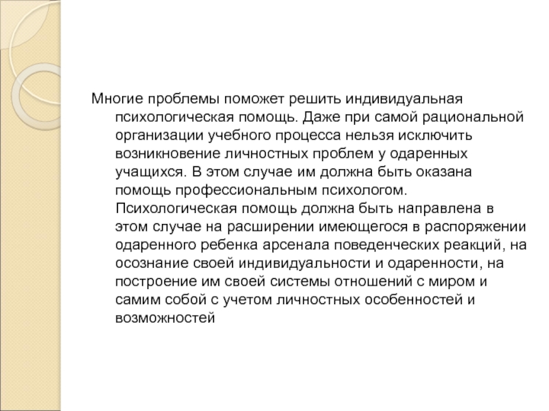 организации учебного процесса нельзя исключить возникновение личностных проблем у одаренных учащихся. В этом случае им должна быть оказана помощь профессиональным психологом. Психологическая помощь должна быть направлена в этом случае на расширении имеющегося в распоряжении одаренного ребенка арсенала поведенческих реакций, на осознание своей индивидуальности и одаренности, на построение им своей системы отношений с миром и самим собой с учетом личностных особенностей и возможностей
