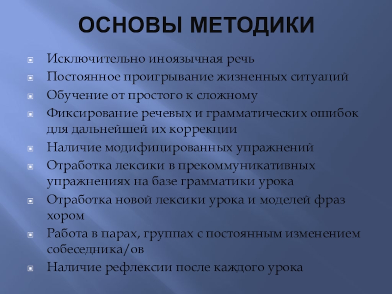 ОСНОВЫ МЕТОДИКИИсключительно иноязычная речьПостоянное проигрывание жизненных ситуацийОбучение от простого к сложномуФиксирование речевых и грамматических ошибок для дальнейшей