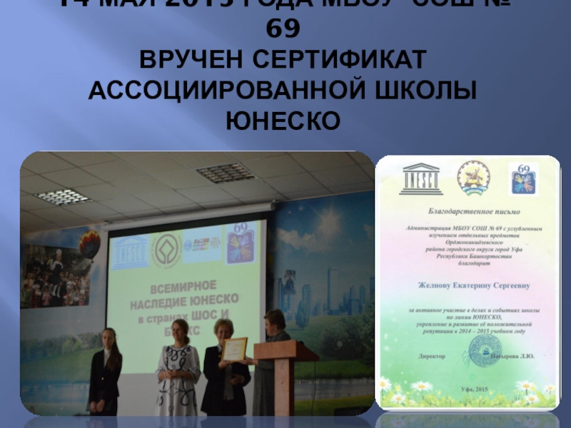 Слайд 1114 мая 2015 года МБОУ СОШ № 69 вручен сертификат Ассоциированной школы ЮНЕСКО