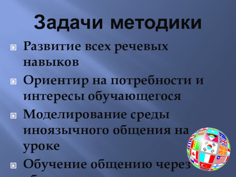 Задачи методикиРазвитие всех речевых навыковОриентир на потребности и интересы обучающегосяМоделирование среды иноязычного общения на урокеОбучение общению через