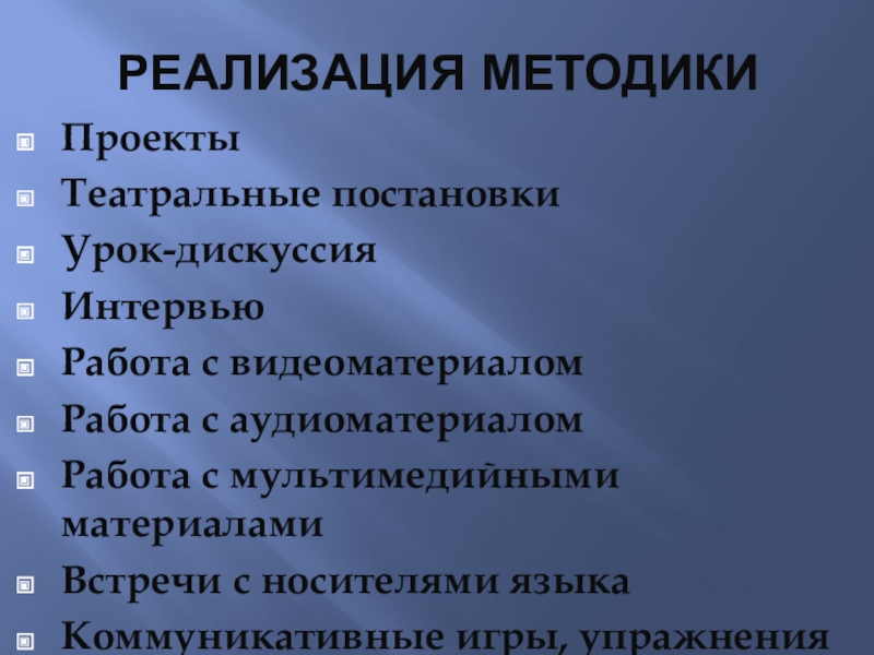 РЕАЛИЗАЦИЯ МЕТОДИКИПроектыТеатральные постановкиУрок-дискуссияИнтервьюРабота с видеоматериаломРабота с аудиоматериаломРабота с мультимедийными материаламиВстречи с носителями языкаКоммуникативные игры, упражнения
