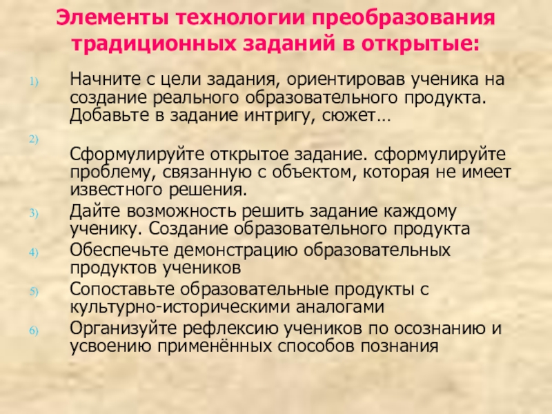 Слайд 24Элементы технологии преобразования традиционных заданий в открытые: