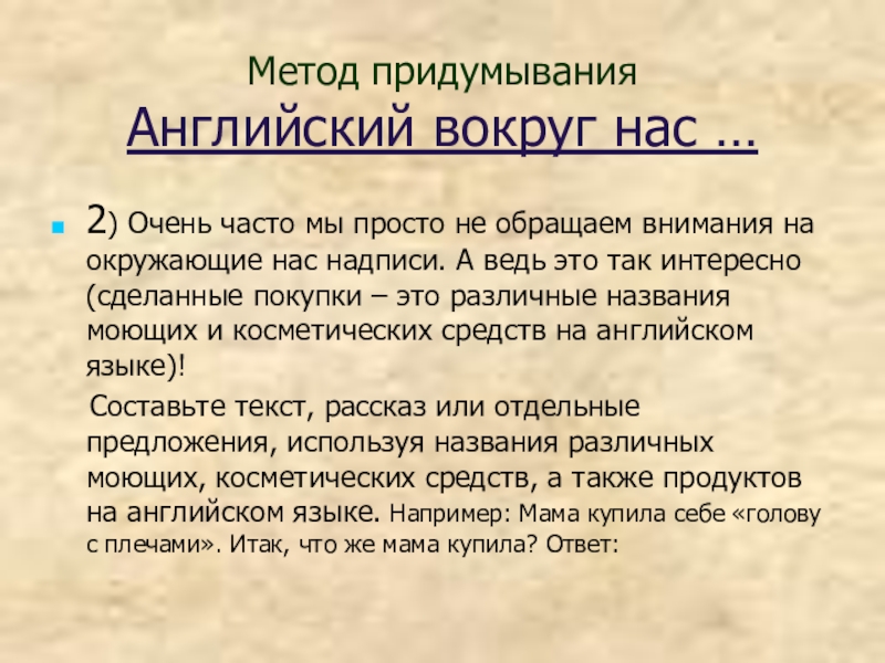 внимания на окружающие нас надписи. А ведь это так интересно (сделанные покупки – это различные названия моющих и косметических средств на английском языке)!