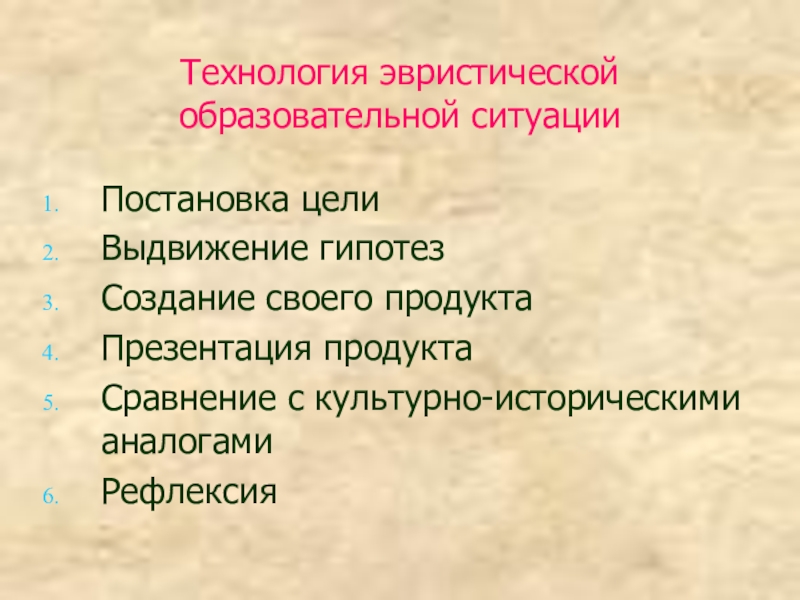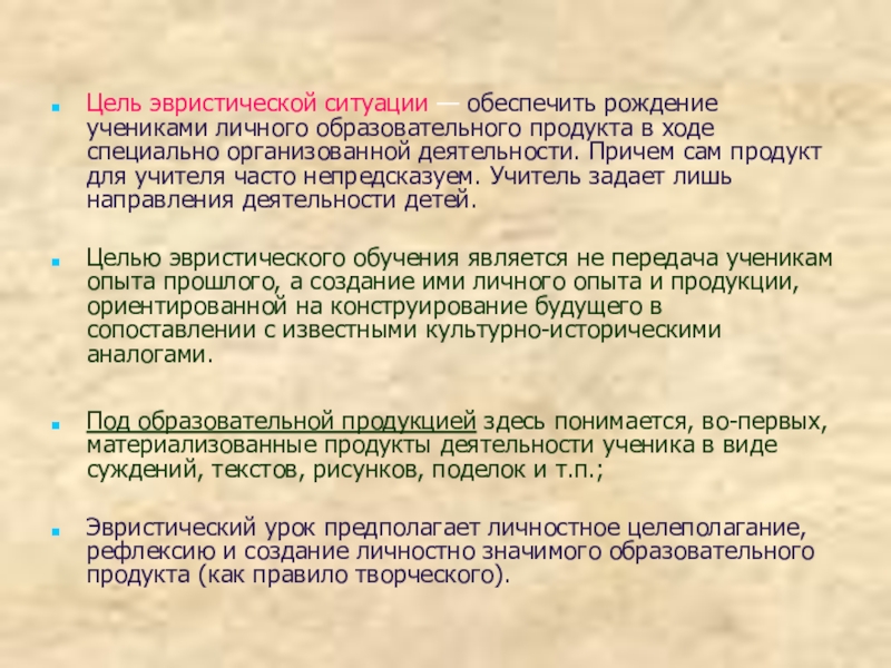 Целью эвристического обучения является не передача ученикам опыта прошлого, а создание ими личного опыта и продукции, ориентированной на конструирование будущего в сопоставлении с известными культурно-историческими аналогами.