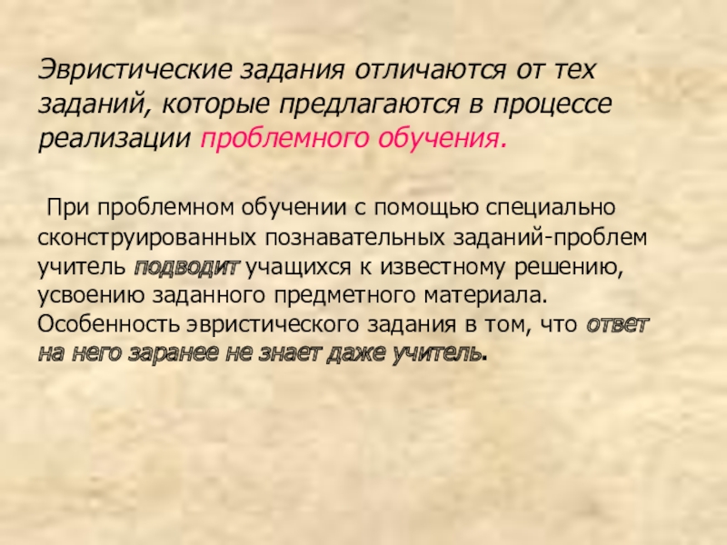 При проблемном обучении с помощью специально сконструированных познавательных заданий-проблем учитель подводит учащихся к известному решению, усвоению заданного предметного материала. Особенность эвристического задания в том, что ответ на него заранее не знает даже учитель.
